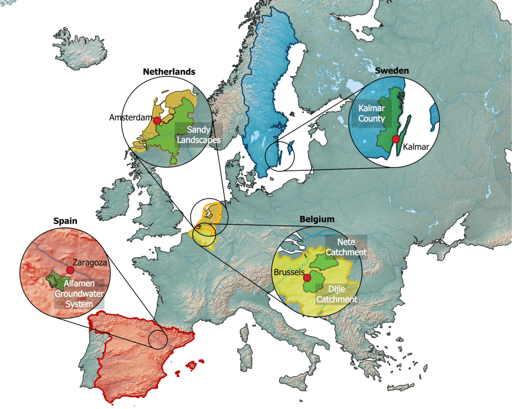 In Belgium, Netherlands, and Spain, groundwater is predominantly abstracted for drinking water supply and agriculture. In Sweden, the sparsed aquifer meet nearly all water demands of small towns (< 3,000 inhabitants).)In all locations nature and groundwater-dependent ecosystems are highly relevant, especially in light of the European Water Framework Directive.