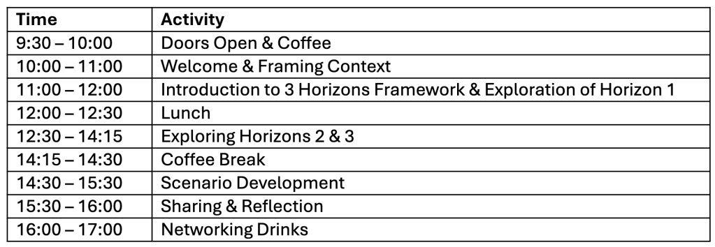 - A practical, futures-oriented approach: Using the 3 Horizons method, we will explore three futures: Horizon 1 – Business as Usual, Horizon 2 – Disruptive Innovation, and Horizon 3 – Ideal Future — to envision different groundwater drought futures for the region.
